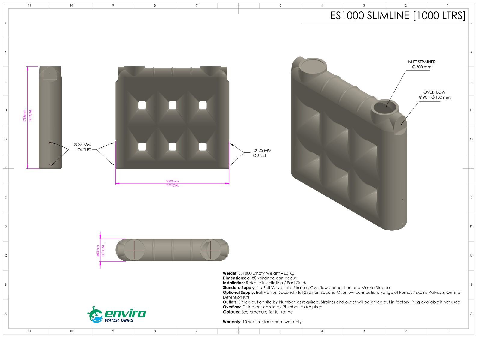 2. Tanks must be on a level base of concrete 100mm thick with a minimum strength 25m.p.a. and one layer of F72 reinforcement.