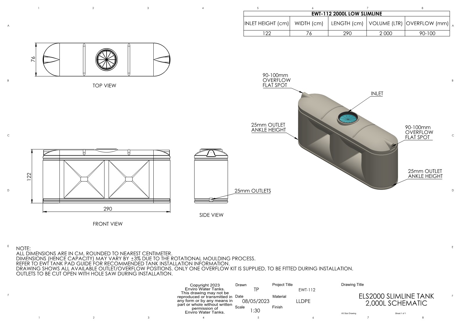 2. Tanks must be on a level base of concrete 100mm thick with a minimum strength 25m.p.a. and one layer of F72 reinforcement.