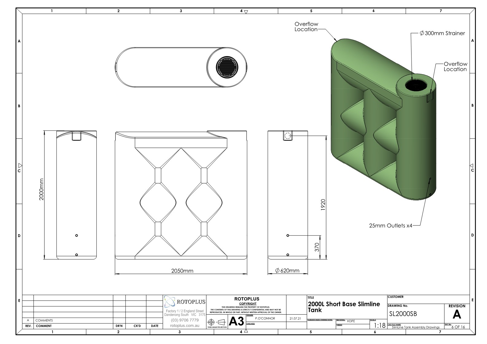 The 2000 litre Short base water tank is 2000mm long, 620mm wide and 2000mm high. With a narrow width this tank will also fit between down pipes and windows and it is highly suitable for granny flats or courtyards. Being small and compact this tank can be easily moved into position.