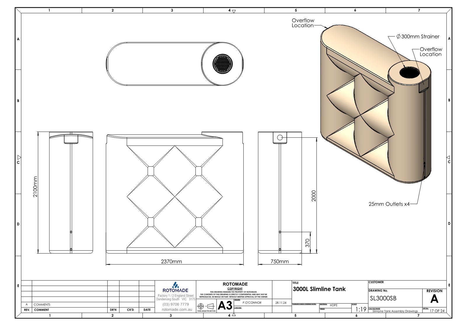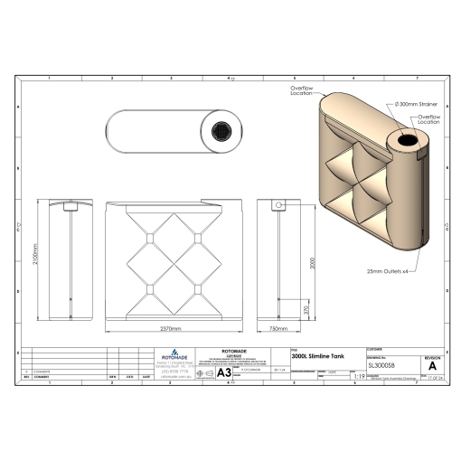 The 3000 litre short base tank is 2370mm long 750mm wide and 2100mm high. With a narrow width this tank will also fit between down pipes and windows and it is highly suitable for granny flats or courtyards. Its short base is a hit with builders and home owners alike. Being small and compact this tank can be easily moved into position.