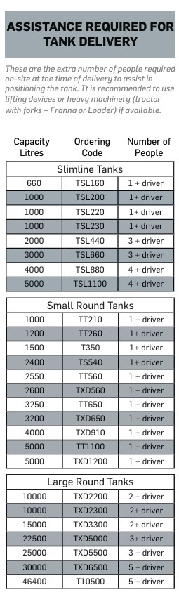 Note: Due to WHS/OH&S drivers will not unload or transport the tank to the installation-site, or leave the tank on-site if insufficient assistance or unsafe access is provided. The driver has the final decision to assess suitability of the site. We take no responsibility for tanks being damaged if site is unprepared. If delivery cannot be made in the first instance due to the site not being ready, insufficient access or not enough people on hand, re-delivery will occur with additional costs.